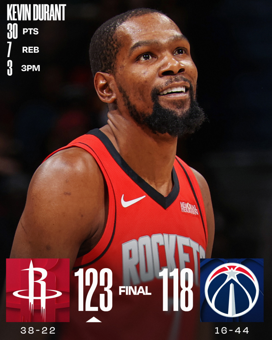 火箭队面对鱼腩奇才根本没有尽全力防守,杜兰特30分7篮板,申京32分12篮板,谢泼德19分10助攻7篮板6抢断2盖帽,阿门22分12篮板,在小贾伤停的情况下还是轻松过关,火箭这个西部第三变得越来越稳健。